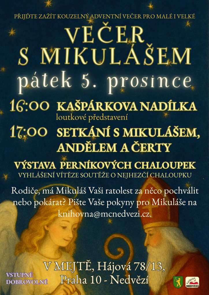 Na 5. prosince připravujeme spolu s místními dobrovolníky Večer s Mikulášem. Program začne v 16 hodin loutkovým představením Kašpárkova nadílka v podání Divadla KA2, inspirovaným staročeskou hrou o tom, proč Mikuláš s andělem nadělují dětem dárky. Kolem 17. hodiny dorazí Mikuláš se svým doprovodem – andělem i čerty – a děti se mohou těšit na malou nadílku (a možná i drobnou připomínku těm méně hodným).