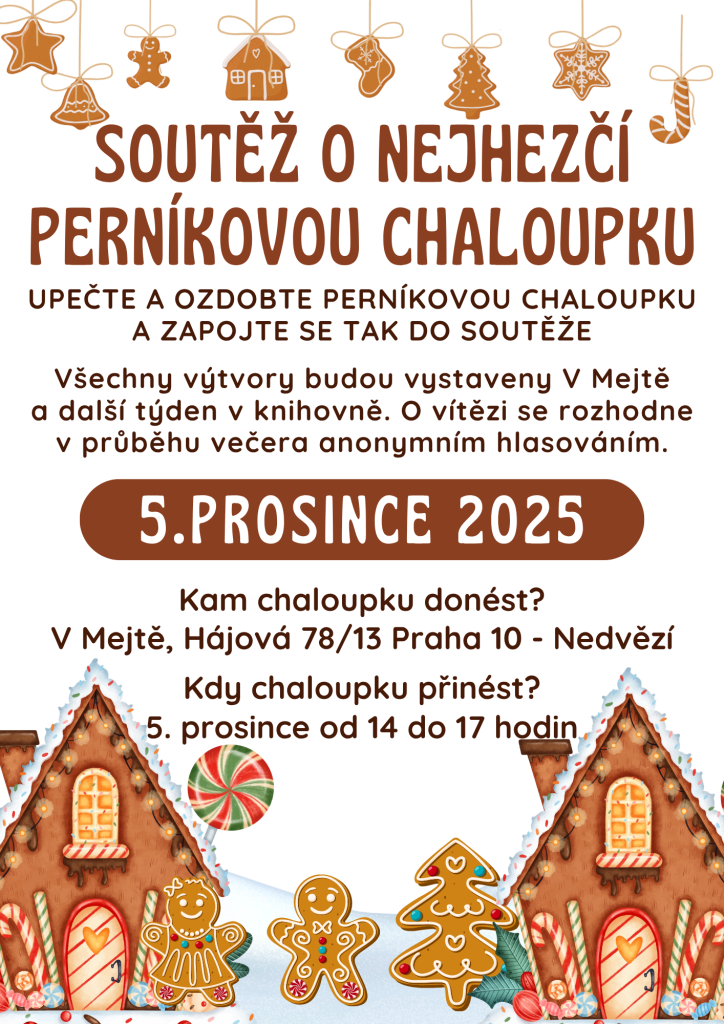 Součástí večera bude také soutěž o nejhezčí perníkovou chaloupku. Své chaloupky můžete přinést 5. prosince do společenského prostoru V Mejtě, Hájová 78/13, mezi 14. a 17. hodinou. Všechny výtvory budou vystaveny, anonymně hodnoceny a během večera vyhlásíme vítěze.